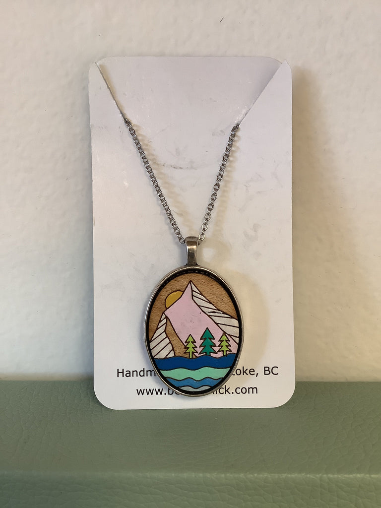 This hand-painted Sick Chick Sunrise Mountain Scene Necklace #14 captures the stunning beauty of Revelstoke BC. The silver chain link measures 13.5 inches, making it easy to wear and a perfect addition to any outfit. Bring a touch of nature and adventure to your wardrobe with this unique and stylish necklace.
