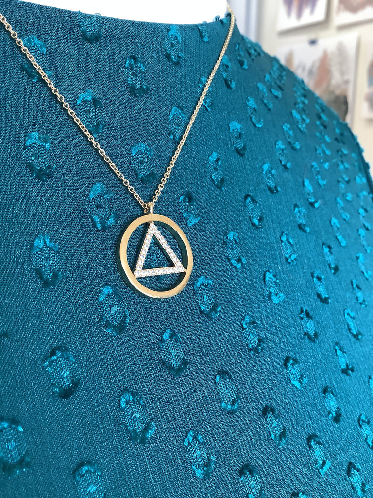 Expertly crafted in Vancouver, this Triangle Circle Gold Necklace from Standout Boutique adds a touch of elegance to any outfit. Made with gold plated brass and adorned with a sparkling zirconia crystal triangle, its adjustable chain ensures a perfect fit. Elevate your style with this stunning, handmade piece.
