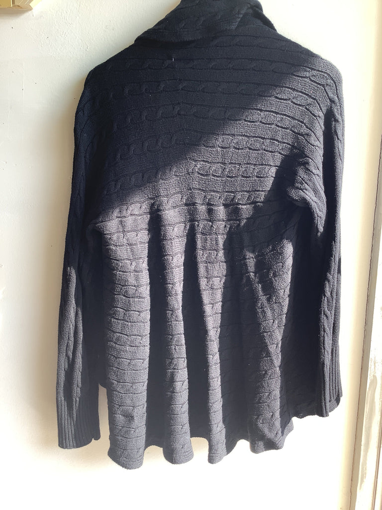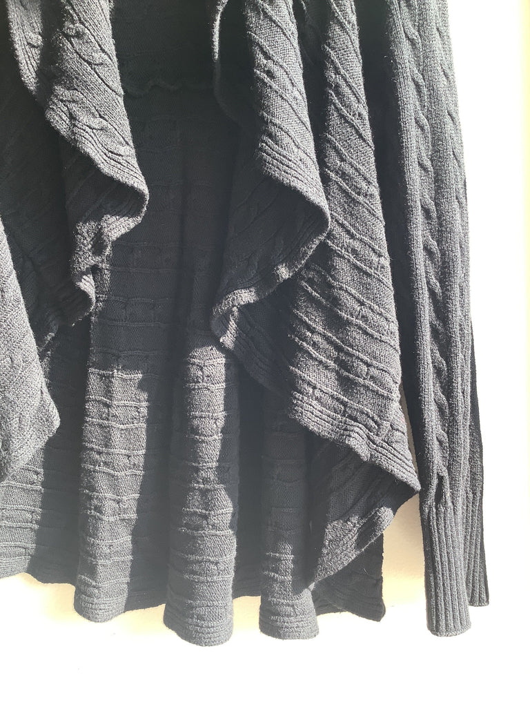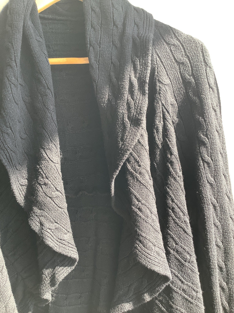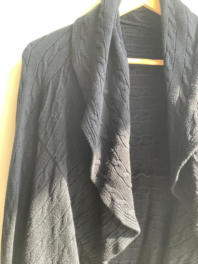 A cozy layering essential, this vintage black cardigan features a soft cable knit design with a beautiful cascading open front. The draped silhouette adds movement and elegance, while the long sleeves and mid-weight knit make it perfect for cooler seasons. Easy to dress up with tailored pants or down with jeans, it’s a versatile staple for any wardrobe. Size Large