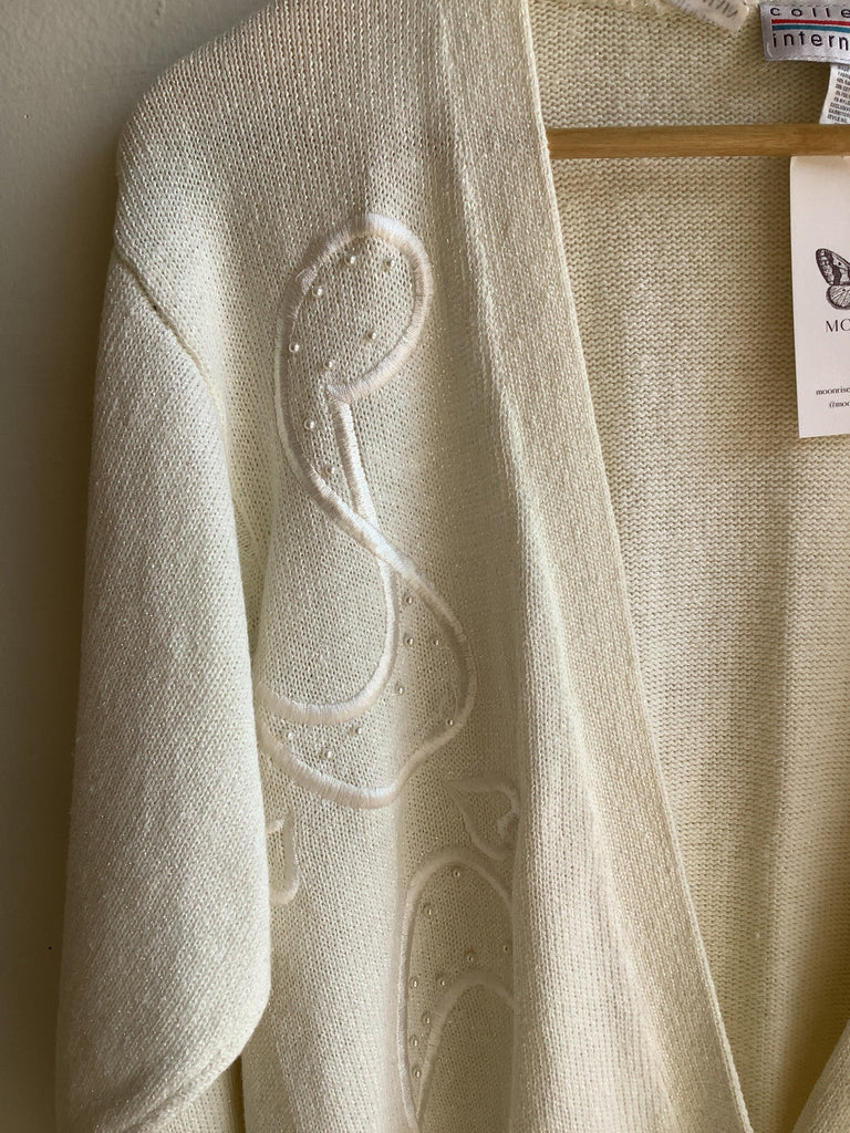 Delicate and dreamy, this Collections Internationale cardigan brings subtle sparkle and charm. Crafted in a cream knit with a lightweight drape, it features tonal embroidered swirls and heart motifs adorned with pearly bead accents. The deep V-neckline and button-front design make it versatile for layering over dresses or pairing with high-waisted denim for a romantic vintage look.