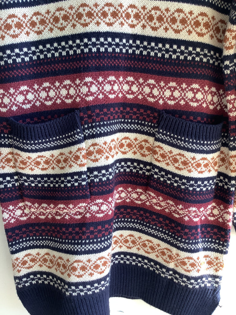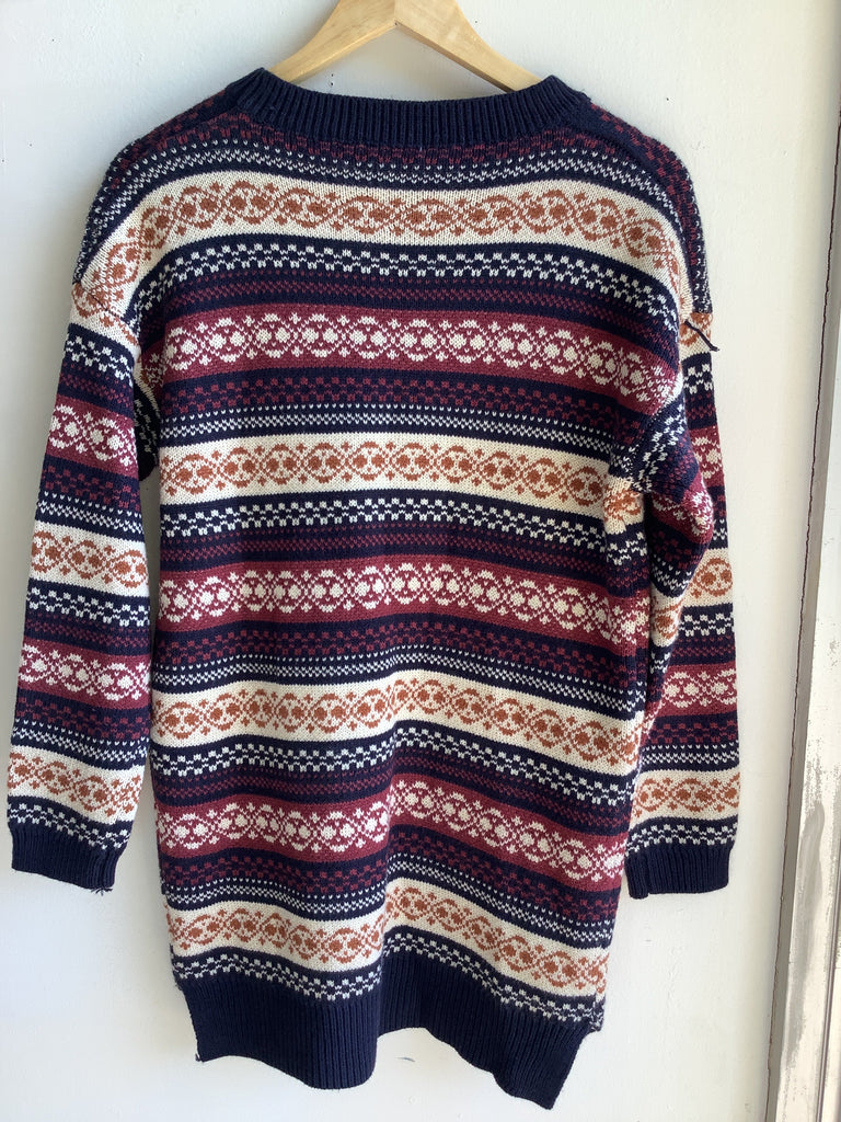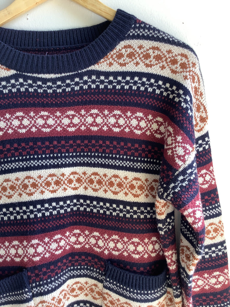Cozy up in this classic Fair Isle patterned sweater dress featuring rich tones of navy, burgundy, cream, and warm caramel. With its longer tunic length and two handy front pockets, this piece is as practical as it is stylish. Perfect for layering with leggings or jeans on chilly days, it gives off effortless vintage après-ski vibes.