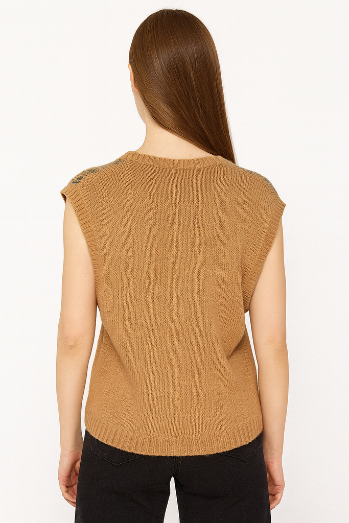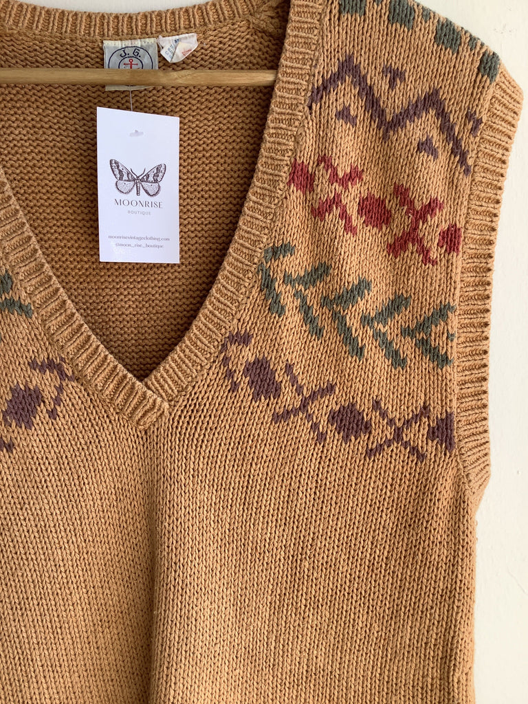 This 1980s/90s J.G. Hook sweater vest is a warm caramel brown with charming folk-inspired knit embroidery in shades of green, plum, and red. Featuring a deep V-neckline and sleeveless cut, it’s perfect for layering over crisp blouses, turtlenecks, or dresses. The soft, mid-weight knit has a blend of 40% cotton, 40% rayon, and 20% linen, giving it a breathable yet cozy texture.