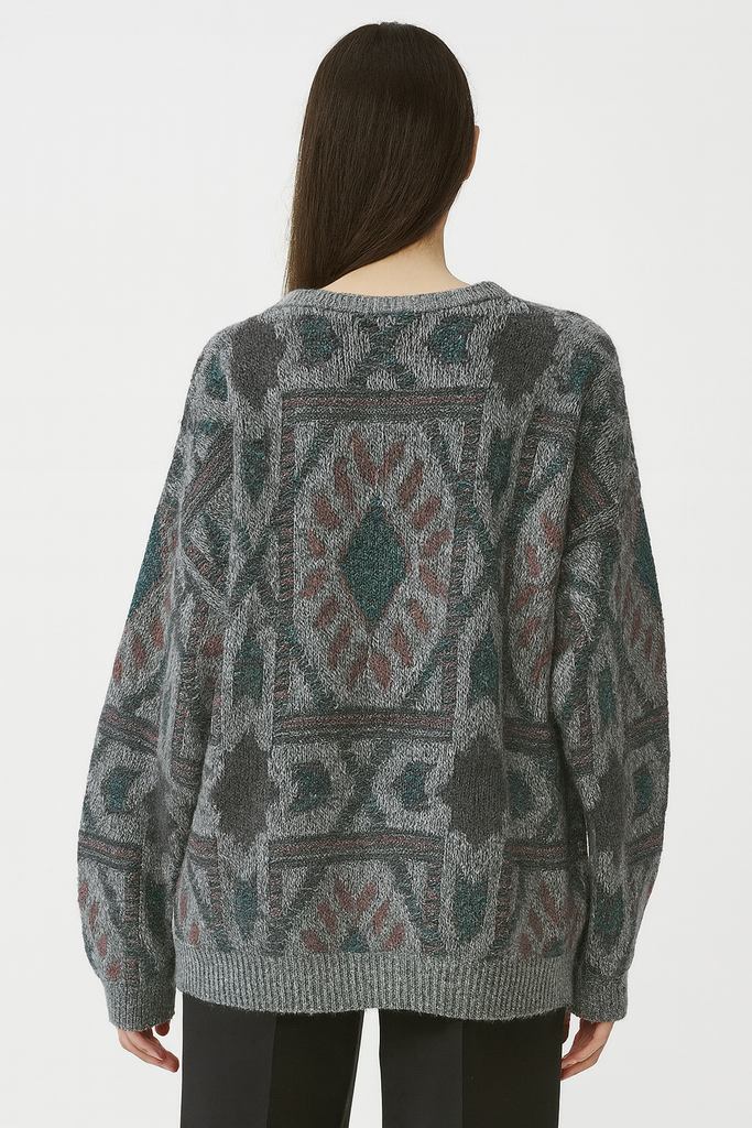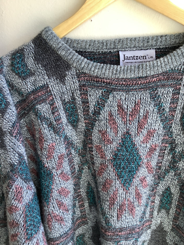 This cozy 80s/90s-era Jantzen sweater features a bold geometric pattern in shades of teal, burgundy, charcoal, and heather grey. Soft knit with a relaxed, slightly oversized fit, ribbed cuffs and hem, and a classic crew neckline. Perfect for layering on chilly days or styling with high-waisted denim for a true retro vibe.