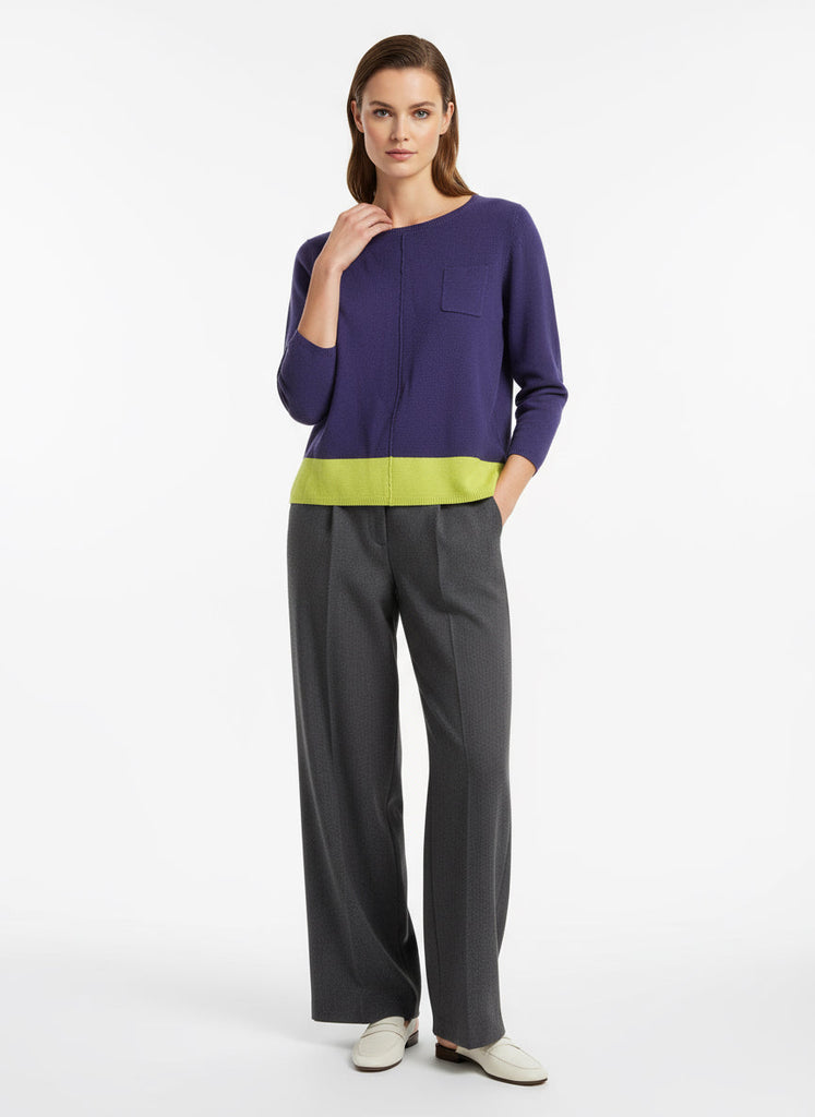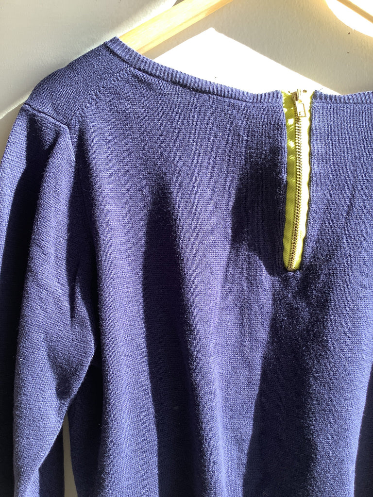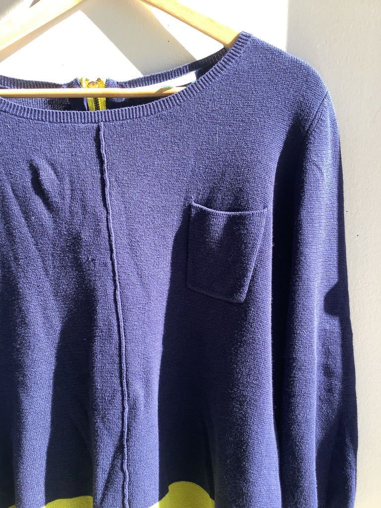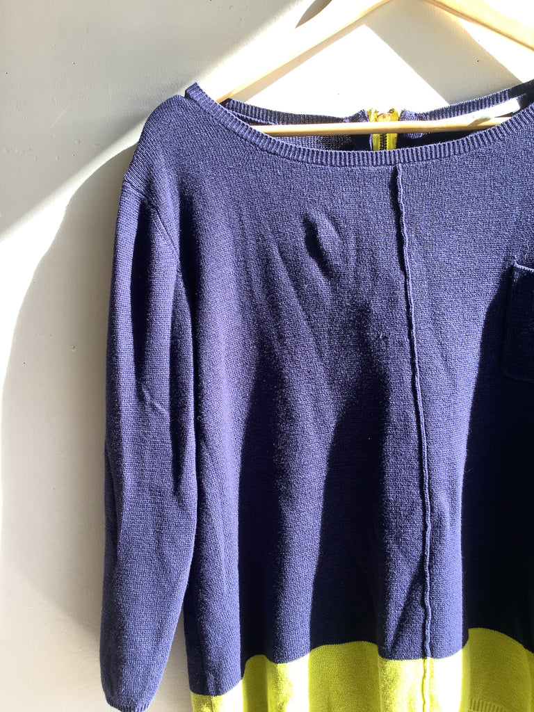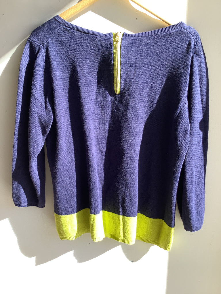 A chic and modern-feeling vintage knit from Cleo Petites, featuring a bold navy body with a bright chartreuse hemline. Designed with a boat neckline, ¾ sleeves, and a subtle front pocket, this sweater balances classic minimalism with a pop of color. The visible center seam and exposed back zipper give it a slightly contemporary edge while still being timeless. Size Large