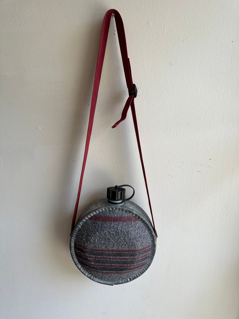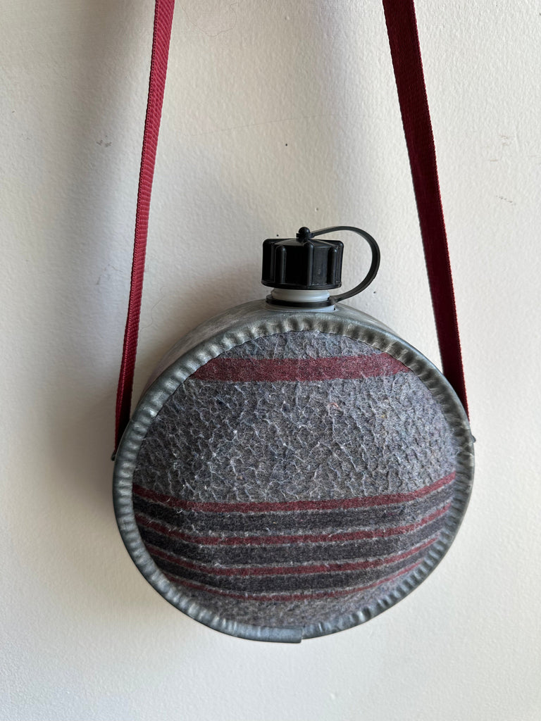 A rustic throwback to wilderness adventures gone by, this vintage metal canteen features classic wool fabric on both sides with a rich charcoal and maroon stripe pattern. Designed with a sturdy red adjustable strap for easy carrying and a secure screw-top lid, it’s as functional as it is nostalgic. Whether you’re hitting the trails or styling a unique decor moment, this piece brings a touch of heritage to any scene.