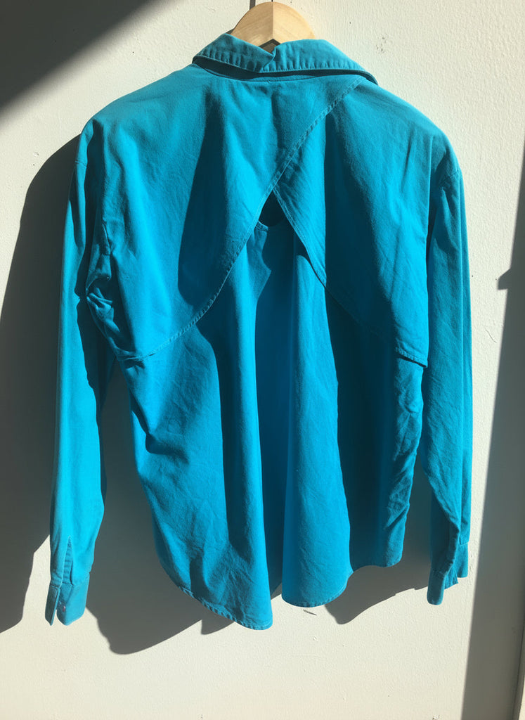 This bold and vibrant Side Saddle (1993) button-up is the perfect throwback piece for lovers of vintage western style. Made from 100% cotton, the shirt features a striking teal base with colorful southwestern-inspired embroidery along the chest and pockets. With its relaxed fit, pointed collar, and long sleeves, it’s ideal for layering or wearing on its own as a statement piece. Size Med