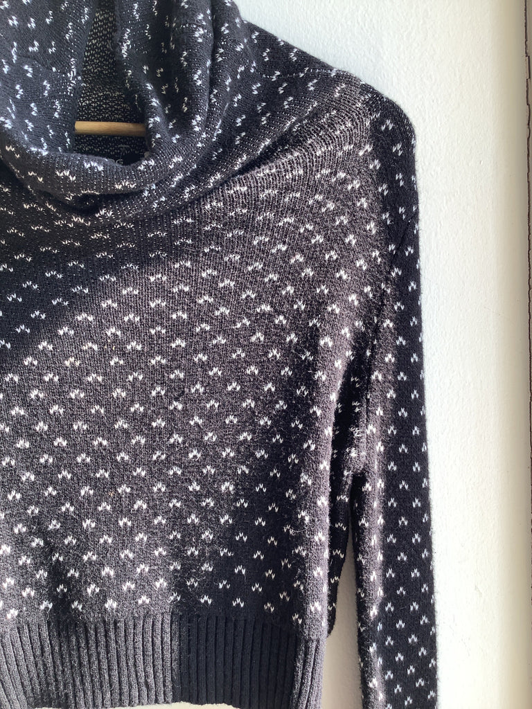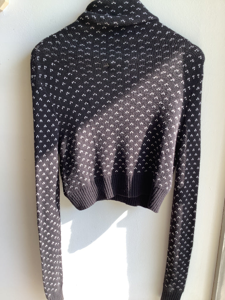 A cozy and stylish piece from BDG.  This cropped knit sweater features a chic black-and-white micro pattern with a slouchy cowl turtleneck. Perfectly fitted at the waist and cuffs, it’s a flattering piece for layering or wearing solo with high-waisted denim or skirts. Size XS