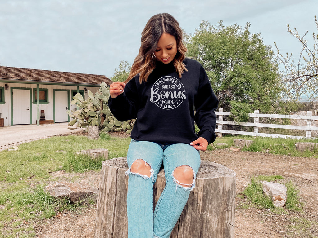 Be the Bonus Mom everyone loves with this fun crewneck sweatshirt! Show off your effortless style while being cool, comfy, and casual. Look great, feel better - it's that simple!