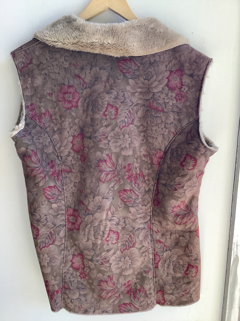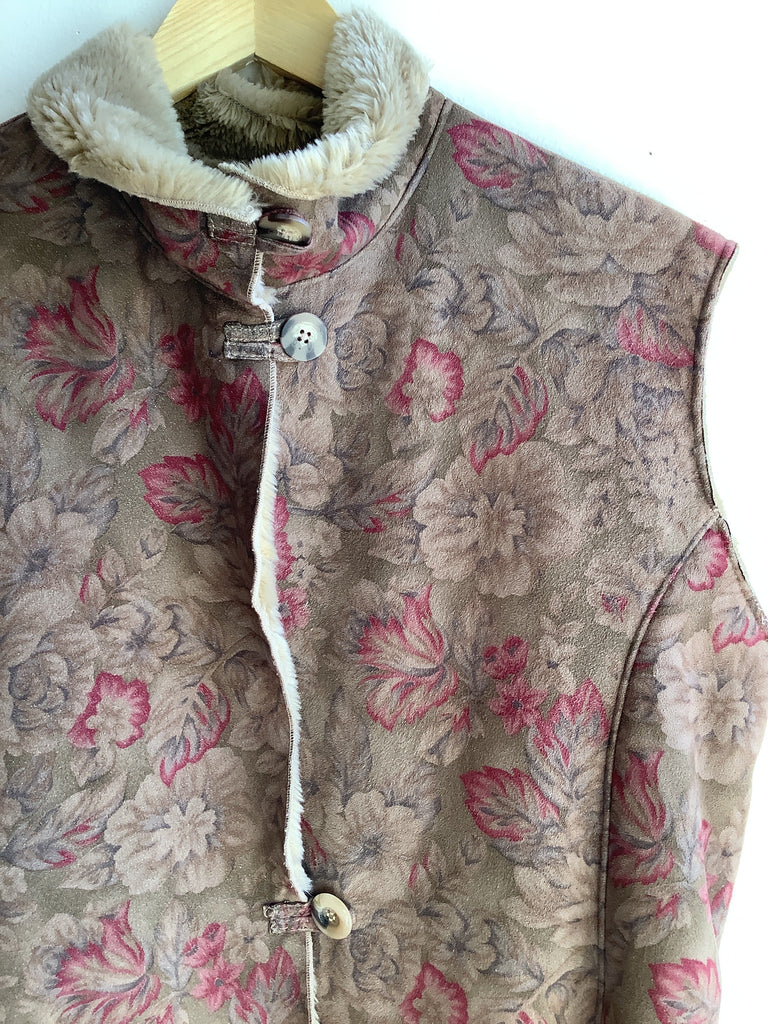 This vintage-inspired Coldwater Creek vest features a soft faux suede shell with a romantic floral pattern in muted rose and taupe tones. Lined with plush faux shearling for warmth and comfort, it closes with three rustic toggle buttons down the front. A perfect layering piece for adding cozy texture and feminine charm to your fall or winter outfits. Size Med