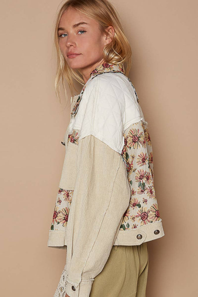 Designed in long sleeve, regular fit, corduroy jacket with quilting point, contrast jacquard fabric patch, raw edge details, front pockets, button down with jacquard collar, vintage washed.