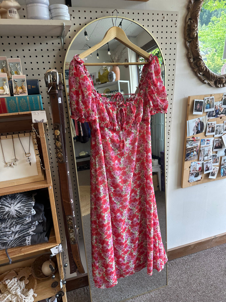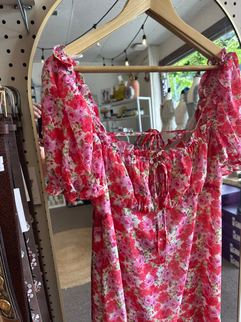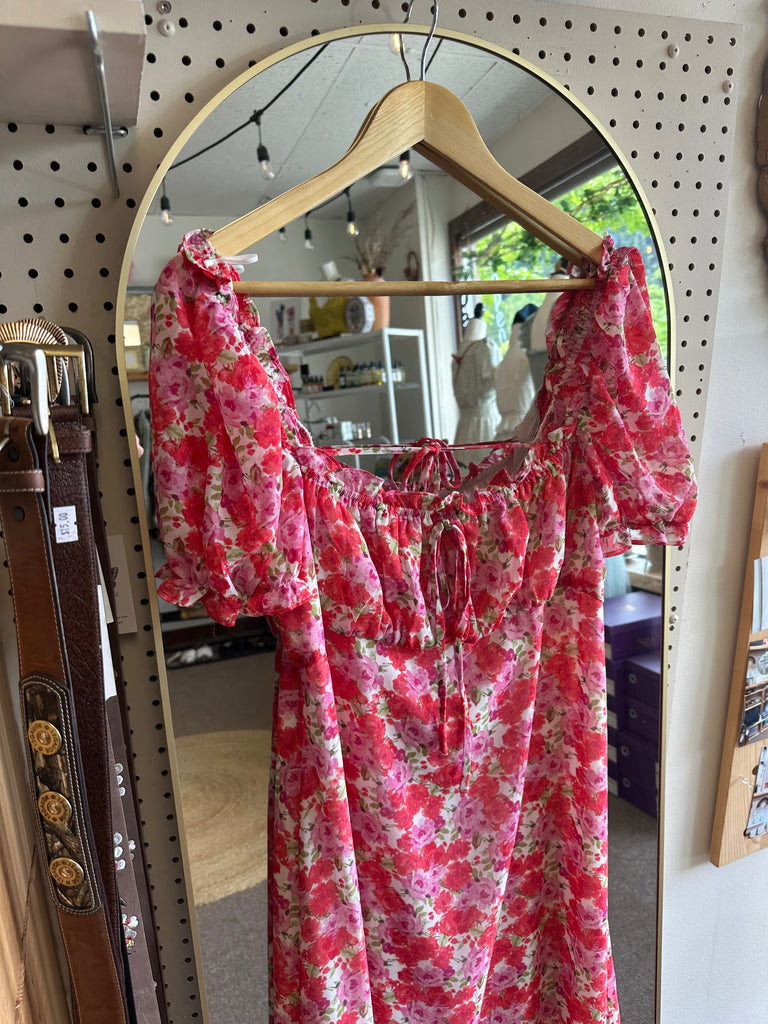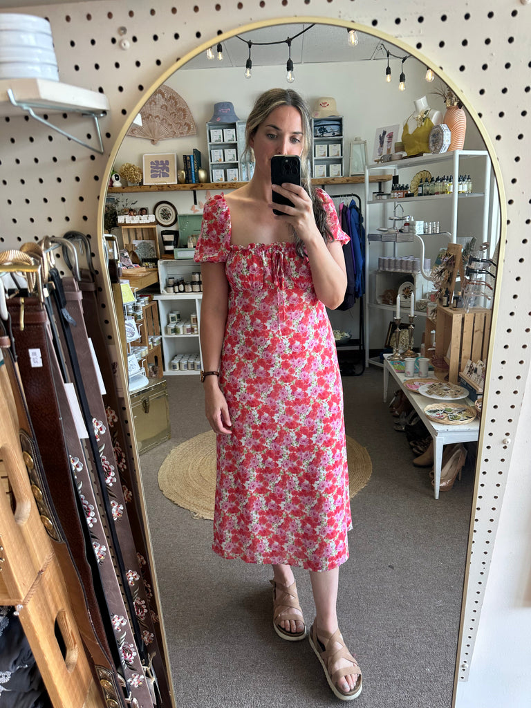 A romantic floral midi dress in a vibrant rosy print, featuring a square neckline, puffed sleeves, and a gentle tie-front detail at the bust. The rayon blend gives it that perfect drape—fitted at the top and flowing at the hem.