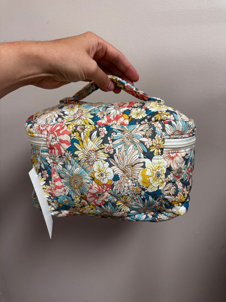 This darling quilted travel case is giving big cottagecore energy with its vibrant vintage floral print and soft, structured shape. Perfect for stashing cosmetics, toiletries, art supplies, or crystals on the go, it features a top handle, full zip closure, and a lightly padded interior to keep your treasures safe. Lightweight and charming with a practical twist—it’s as cute on your shelf as it is in your suitcase.