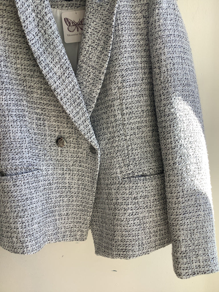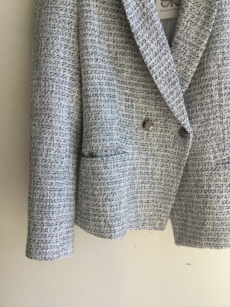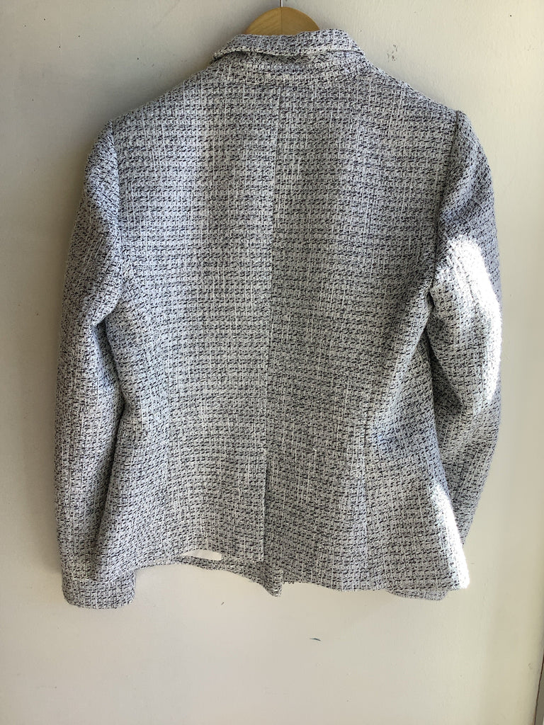 This timeless Le Château blazer is crafted in a chic black-and-white tweed weave with subtle silver threading for just the right touch of shine. Featuring a tailored silhouette, notched lapels, double-button closure, and front pockets, it’s a versatile layering piece that elevates both office and evening looks. Fully lined for comfort and beautifully made in Canada. Size Med