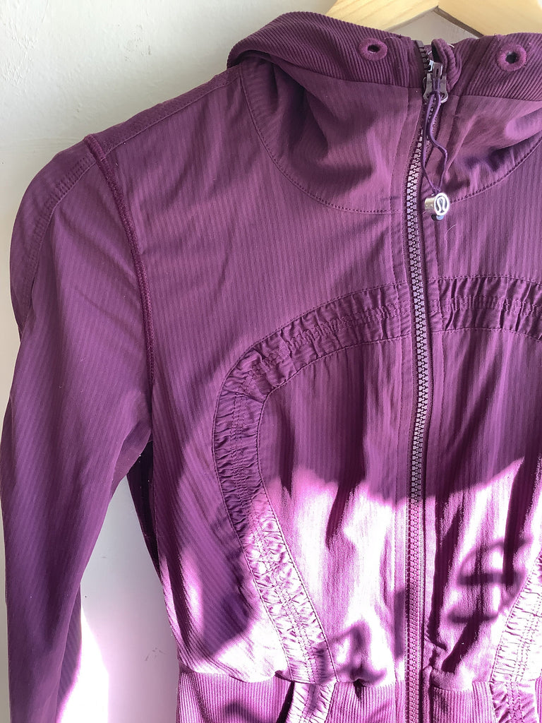 A rare vintage-style Lululemon hoodie in a rich plum purple shade. This lightweight, fitted jacket features a full zip front, hood, thumbholes, and signature Lululemon logo zipper pull. Detailed ruching around the pockets and waist adds a flattering, feminine touch. Perfect for layering over activewear or casual outfits.