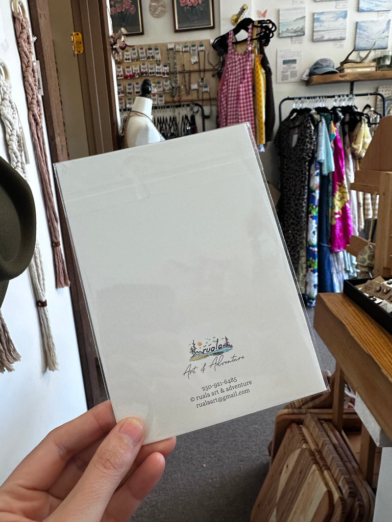 Painted by local artist Ruala Art & Adventure, this vibrant card celebrates the beauty of simple pleasures—like swinging high above wildflowers with the mountains and lake glowing under the evening sun. The warm tones and playful spirit make it a keepsake worth framing, or a heartfelt card to share with someone special.