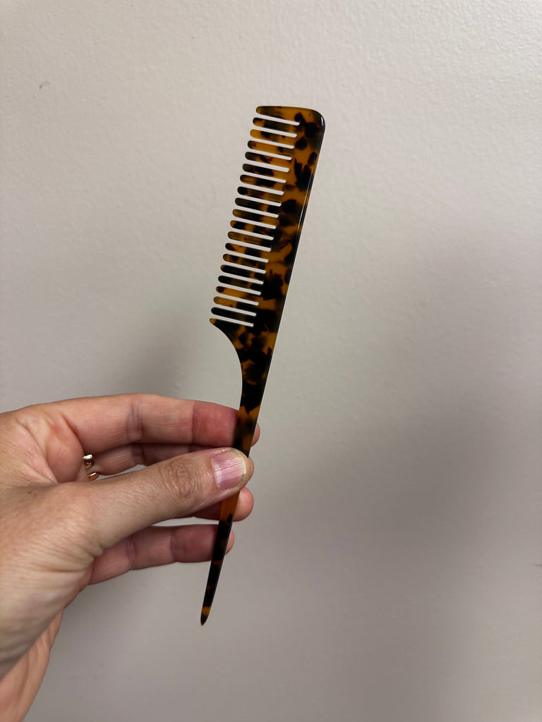 This sleek tortoiseshell-style tail comb is the perfect blend of vintage glam and everyday utility. With wide-set teeth for gentle detangling and a pointed handle for precise parting, it’s a must-have for creating clean sections, teasing volume, or crafting dreamy updos. Lightweight and durable, it’s as pretty on your vanity as it is in your hand.