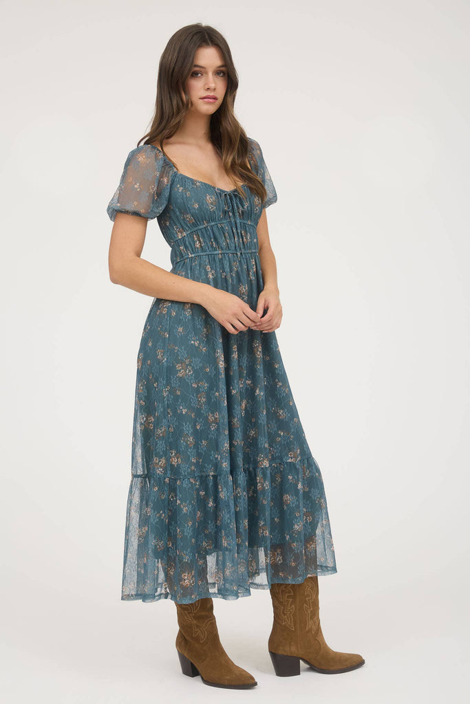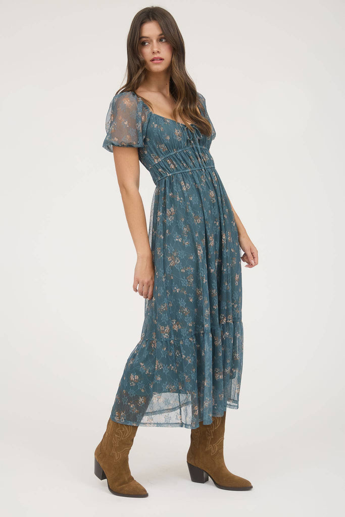 Step into your soft-girl summer era with The Twilight Garden Dress — a dreamy teal maxi covered in delicate floral print. Featuring a ruched bust with a tie detail, sheer puff sleeves, and a tiered hem that moves like magic, this romantic piece is perfect for barefoot garden walks, weddings, or late afternoon golden hours.